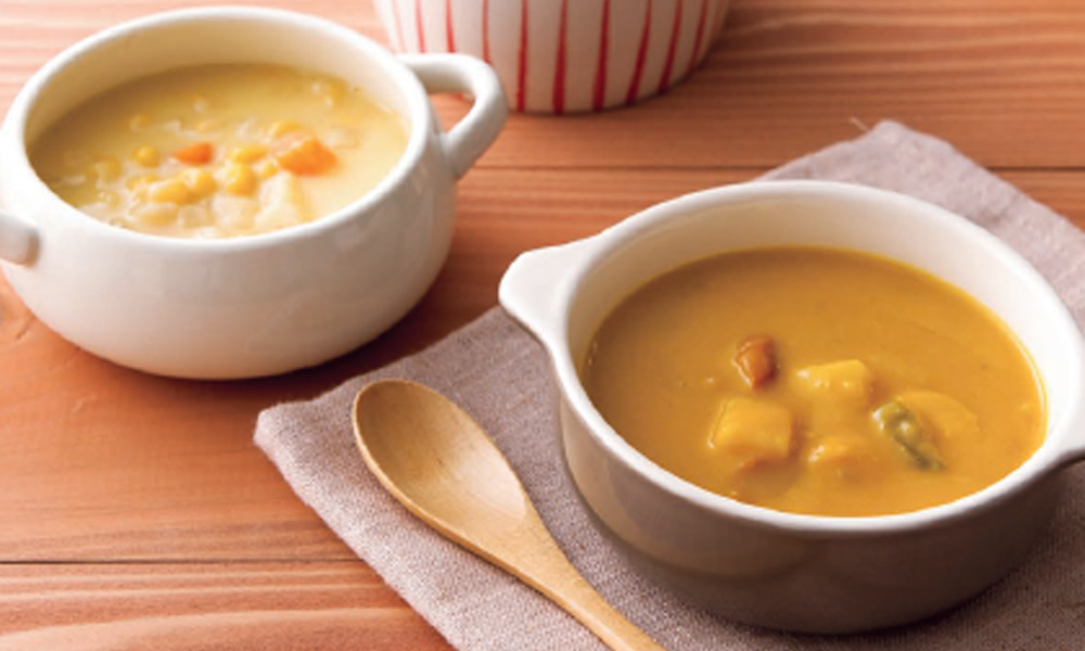 国産かぼちゃの甘みといんげんまめの食感がちょうどよいかぼちゃチャウダーと国産とうもろこしと野菜を使ったコーンチャウダー。具だくさんの食べるスープです。食卓に手軽にプラスできるスープセット。