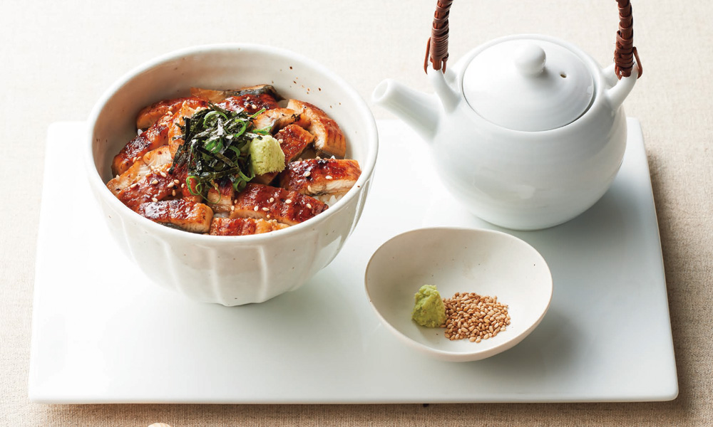 鰹だしとお茶をブレンドした蒲焼タレでふっくらと焼きあげた鰻をひつまぶしにしました。そのままあたたかいごはんにのせて丼物としてもおいしくいただけます。最後の〆は薬味と一緒にお茶漬けで。